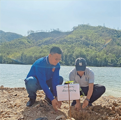中老工作人员在老挝南欧江一级水电站培育树苗。赛亚棒摄