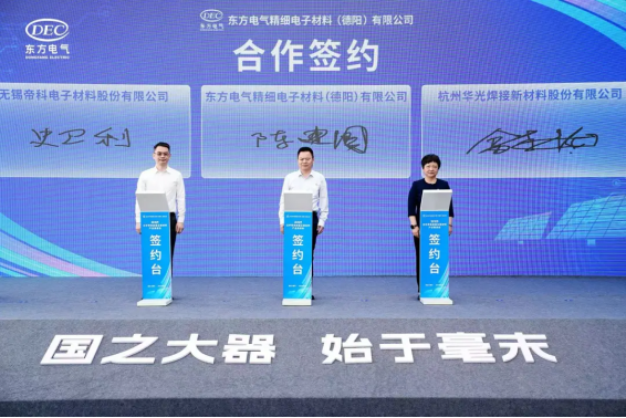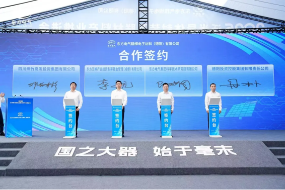 会上,东方精材分别与无锡帝科、杭州华光签订合作协议,绵竹市政府与东方研究院签署合作协议,东方江峡产业投资、德阳投资控股集团、四川绵竹高发投资集团、东方研究院签订合作协议,江苏瀚思瑞与四川绵竹高新技术产业园区签订合作协议。